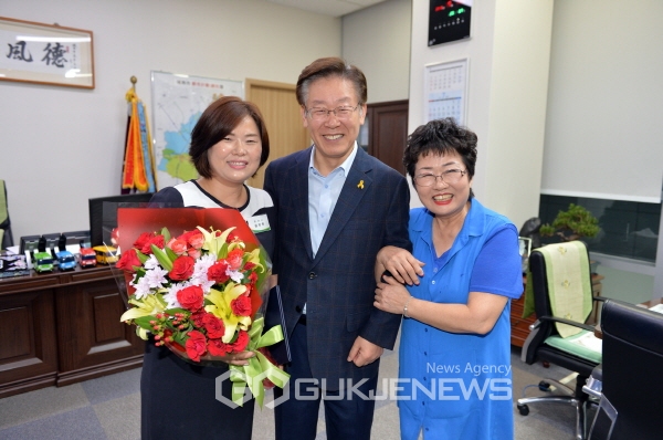 (성남=국제뉴스) 김아라 기자 = 1일 오후 3시30분 이재명 성남시장 집무실. 성남시청에서 4년6개월동안 기간제 근로자로 근무했던 김지연씨는 눈물을 멈추지 못했다. 김씨의 시어머니 성근모씨는 꽃다발을 이 시장에게 안겼다. 성씨는 "며느리에게 평생 잊지 못할 좋은 선물을 안겨줘 정말 고맙다"고 이 시장에게 감사했다.