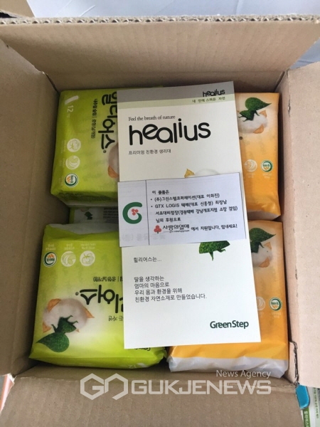이날 배송한 물품은 성남거주 이화진 대표가 운영하는 ㈜그린스텝코퍼레이션(친환경 여성용품제조업체)에서 후원한 생리대 1000박스(8800만원상당)다.