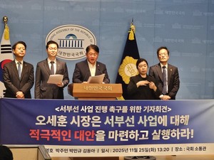 (서울=국제뉴스) 고정화 기자 = 더불어민주당 김병기·김영호·박주민·박민규·김동환 의원들은 25일 국회에서 기자회견을 열고, 서울 서부권·서남권 주민들의 숙원 사업인 서부경전철 건설 지연 문제를 강하게 비판했다.의원들은 “서부선은 은평·서대문·동작·관악 등 교통 소외 지역 주민들의 출퇴근과 생활 편의를 위한 핵심 사업”이라며, 2015년 도시철도망 구축 계획에 포함된 이후 여러 절차를 거쳤지만 오세훈 시장 취임 이후 사실상 사업이 멈춰섰다고 지적했다.또한 컨소시엄 내 주요 건설사 이탈, 추가 공사비 논란, 대체 시공사 미확정 등으로