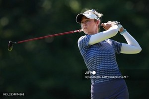 (미국=국제뉴스) 박근영 기자 = 미국의 넬리 코르다가 11일(현지시간) 오하이오주 신시내티의 TPC 리버스 벤드에서 열린 크로거 퀸 시티 챔피언십 1라운드 4번 티에서 샷을 하고 있다.