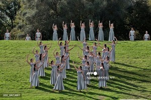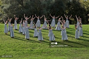 (그리스=국제뉴스) 김현승 기자 = 여배우들이 24일(현지시간) 고대 올림픽의 발상지인 그리스 남부 올림피아 유적지에 있는 헤라 신전에서 '2026년 밀라노-코르티나담페초 동계올림픽'을 위한 올림픽 성화 점화 리허설을 하는 동안 공연을 펼치고 있다.