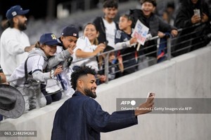 (미국=국제뉴스) 이기철 기자 = 샌디에이고 FC의 아니발 고도이(20번)가 24일(현지시간) 미국 캘리포니아주 샌디에이고 스냅드래곤 스타디움에서 열리는 샌디에이고 FC와 미네소타 유나이티드의 2025 메이저리그사커(MLS)컵 플레이오프(PO) 컨퍼런스 준결승전이 시작되기 전 팬들과 셀카를 찍고 있다.