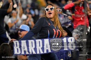 (미국=국제뉴스) 이기철 기자 = 샌디에이고 FC의 서포터가 24일(현지시간) 미국 캘리포니아주 샌디에이고 스냅드래곤 스타디움에서 열린 샌디에이고 FC와 미네소타 유나이티드의 2025 메이저리그사커(MLS)컵 플레이오프(PO) 컨퍼런스 준결승에서 환호하고 있다.