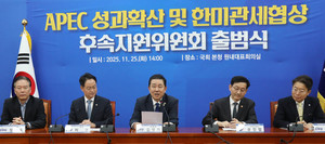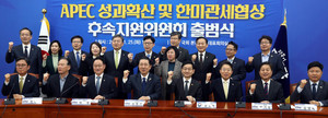 (서울=국제뉴스) 김병기 더불어민주당 원내대표와 윤창렬 국무조정실장 등 참석자들이 25일 서울 여의도 국회에서 열린 APEC 성과확산 및 한미관세협상 후속지원위원회 출범식에서 기념촬영을 하고 있다. ./사진=이용우 기자