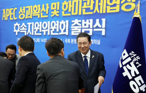 (서울=국제뉴스) 김병기 더불어민주당 원내대표가 25일 서울 여의도 국회에서 열린 APEC 성과확산 및 한미관세협상 후속지원위원회 출범식에서 참석자들과 인사하고 있다./사진=이용우 기자