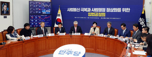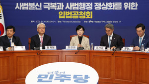 (서울=국제뉴스) 전현희 더불어민주당 사법불신 극복·사법행정 정상화 TF 단장과 참석자들이 25일 사법불신 극복과 사법행정 정상화를 위한 입법공청회에서 기념촬영하고 있다./사진=이용우 기자