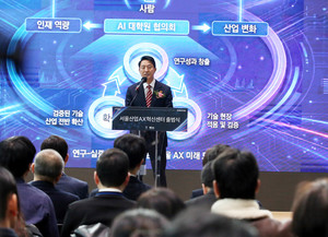 (서울=국제뉴스) 25일 서울 서초구 AI 허브 메인센터에서 열린 AX 혁신센터 출범식에서 오세훈 서울시장, 최호정 서울시의회 의장, 김준기 서울대 부총장을 비롯한 참석자들이 기념 촬영을 하고 있다./사진=이용우 기자