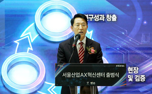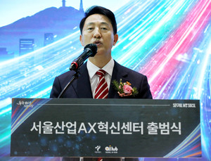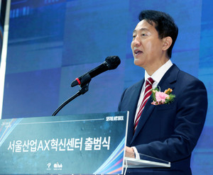 (서울=국제뉴스) 오세훈 서울시장이 25일 서울 서초구 AI 허브 메인센터에서 열린 AX 혁신센터 출범식에서 개회사를 하고 있다./사진=이용우 기자