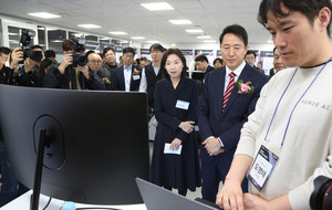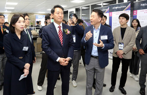 (서울=국제뉴스) 오세훈 서울시장과 최호정 시의회 의장이 25일 서울 서초구 AI 허브 메인센터에서 열린 AX 혁신센터 출범식에 앞서 AX 스타트업 배너 및 전시물 등을 관람하고 있다./사진=이용우 기자