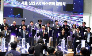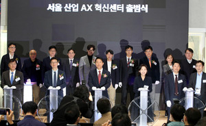 (서울=국제뉴스) 25일 서울 서초구 AI 허브 메인센터에서 열린 AX 혁신센터 출범식에서 오세훈 서울시장, 최호정 서울시의회 의장, 김준기 서울대 부총장을 비롯한 참석자들이 출범 세리머니를 하고 있다./사진=이용우 기자