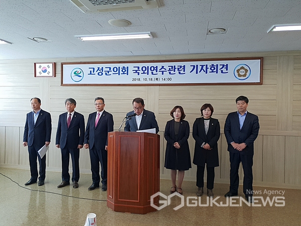 (고성=국제뉴스) 최재헌 기자 = 경남 고성군의회는 18일 고성군의회 회의실에서 이용재 총무위원장을 포함한 초선의원 7명이 참석한 가운데 최근 문제가 되고 있는 국외연수 관련 기자회견을 가졌다.