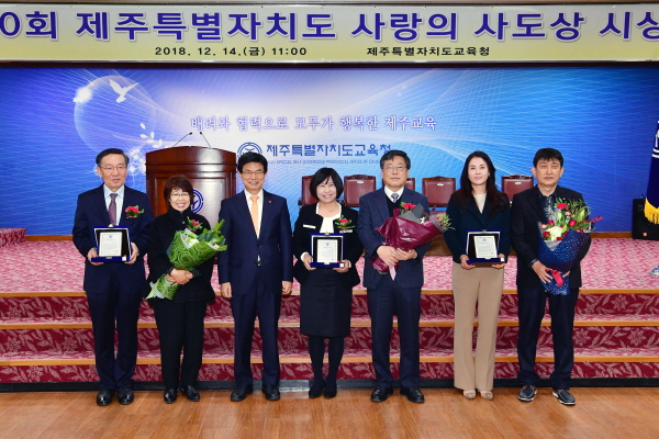 (제주=국제뉴스) 고병수 기자 = 제주지역 올해 '사랑의 사도상'은 노형초 병설유치원 원감 김명신, 동화초 교사 김유랑, 성산고 박홍익 교장이 수상의 영예를 안게 됐다.