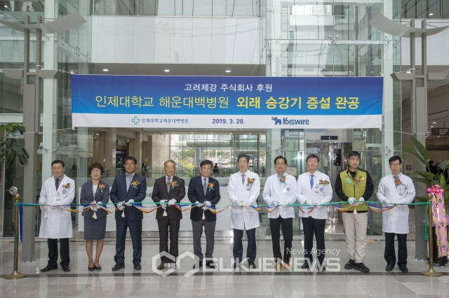 (부산=국제뉴스) 김옥빈 기자 = 인제대학교 해운대백병원은 환자들의 편의증대를 위해 약 5개월간의 공사를 통해 총 3대의 외래전용 승강기를 증설하고, 지난 28일 완공식을 가졌다고 29일 밝혔다.
