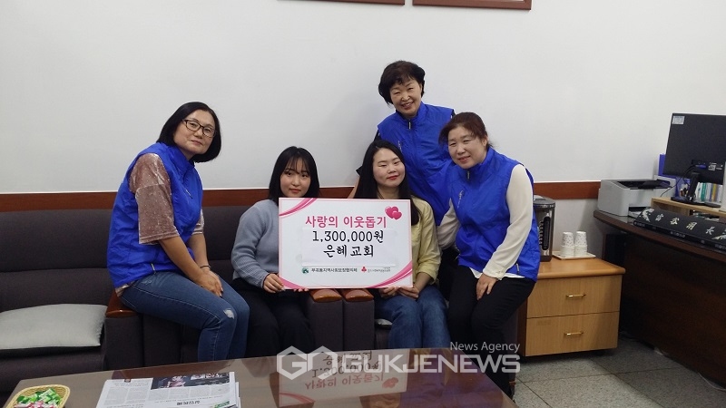 (의왕=국제뉴스) 김보경 기자 = 의왕시 부곡동에 소재한 은혜교회 청년부는 지난해에 이어 바자회를 통해 모은 성금을 부곡지역의 어려운 이웃을 위하여 사용해 달라며 지난 16일 부곡동주민센터에 130만원을 기탁했다.