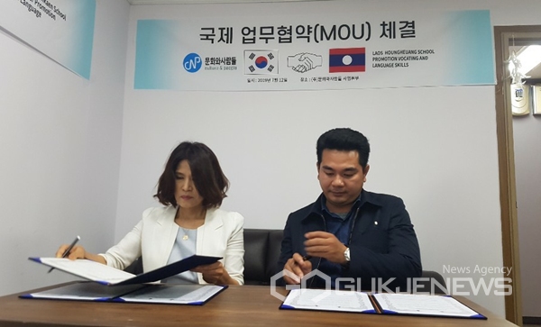 (김해=국제뉴스) 황재윤 기자 = 경남 김해시에 자리잡고 있는 사회적기업 ㈜문화와사람들은 지난 13일 사업본부에서 한글 교육기관인 태국 콩켄(Khonkaen)과 라오스 홍흥(Houngheuang)과 경제와 문화 등 양국 간 민간 경제·문화 교류 등을 위한 업무협약(MOU)을 체결했다고 16일 밝혔다.