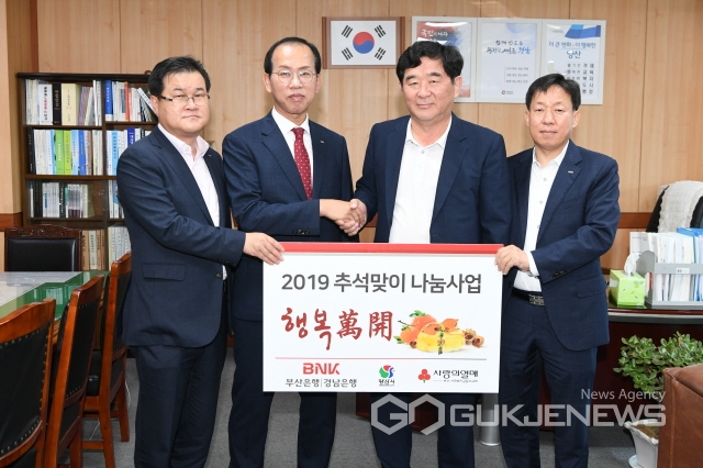 (양산=국제뉴스) 박영헌 기자 = BNK금융그룹이 추석을 맞아 지역 어려운 이웃들을 위해 생필품 선물세트 600박스(3천만원 상당)을 양산시에 기탁했다.