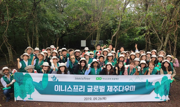 이번 봉사활동은 중국, 미국, 호주 등 13개 국가의 이니스프리 해외 임직원 60여명이 참여한 '글로벌 제주다우미'로 진행됐다. 봉사자들은 최근 제주도를 강타한 태풍 '링링', '타파'로 피해를 입은 곶자왈 탐방로 복구와 정화에 나섰다.