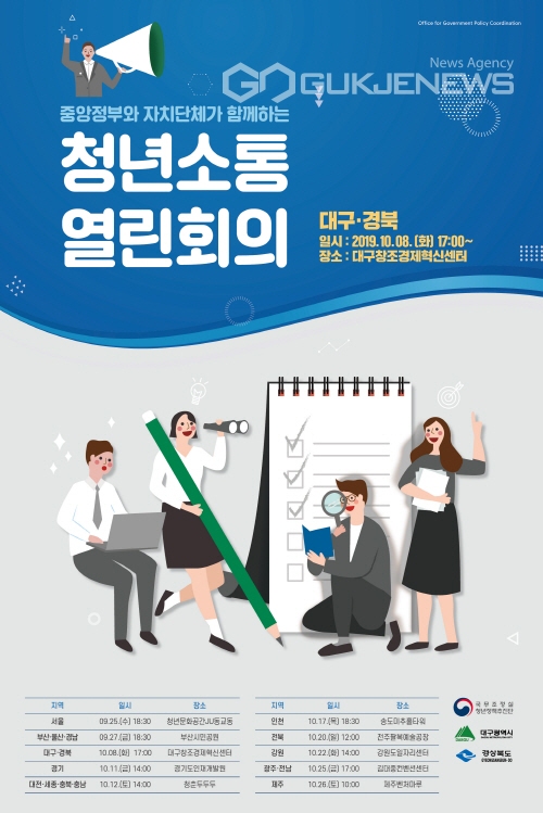 대구시와 경상북도, 국무조정실 청년정책추진단은 10월 8일 17시 대구창조경제혁신센터에서 대구경북 청년 70여명과 함께 「대구·경북 청년소통 열린회의」를 개최한다.
