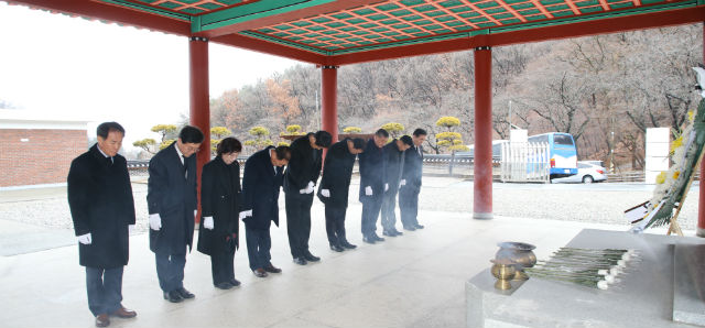 (전북=국제뉴스) 장운합 기자 = 전라북도 의회 송성환 의장과 송지용 부의장, 최찬욱 환경복지위원장 및 의원들이 군경묘지에 헌화 분향하며 호국영령의 넋을 기리고 경자년 새해 의정활동 각오를 다졌다.
