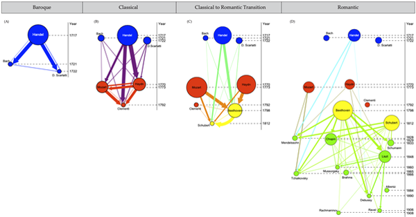 연구팀은 1700년~1900년 사이에 작곡된 서양 피아노 악보로부터 동시에 연주되는 음정으로 만들어진 '코드워드(codeword)'를 추출하고 이론물리학의 한 분야인 네트워크 과학을 적용했다.