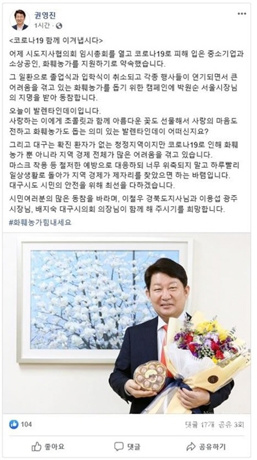 (대구=국제뉴스) 백운용 기자 = 권영진 대구시장은 졸업식과 입학식 등 행사 취소로 어려움을 겪고 있는 화훼농가를 돕고, 침체된 지역경제의 빠른 회복을 위해 '꽃 선물 릴레이' 캠페인에 동참했다.