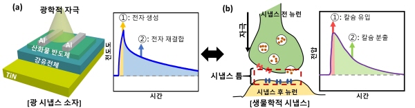 구현된 광 시냅스 소자는 칼슘이온이 유입된 신경세포에서 다음 신경세포로 신경전달물질이 분비되면서 전기적 신호가 전달되는 것처럼,