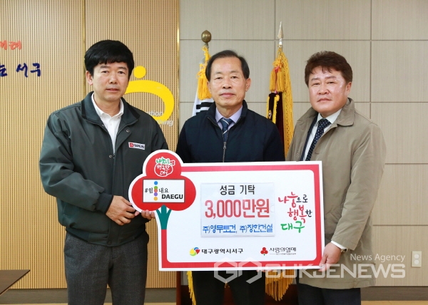 (대구=국제뉴스) 백운용 기자 = 평리재정비촉진지구 평리3구역 주택재개발정비사업 시공사인 ㈜영무토건(대표이사 박헌택)과 ㈜장한건설(대표이사 김요한)은 11일 서구청을 방문해 코로나-19 위기 극복과 지역경제 회생을 위해 성금 3000만 원을 전달했다.