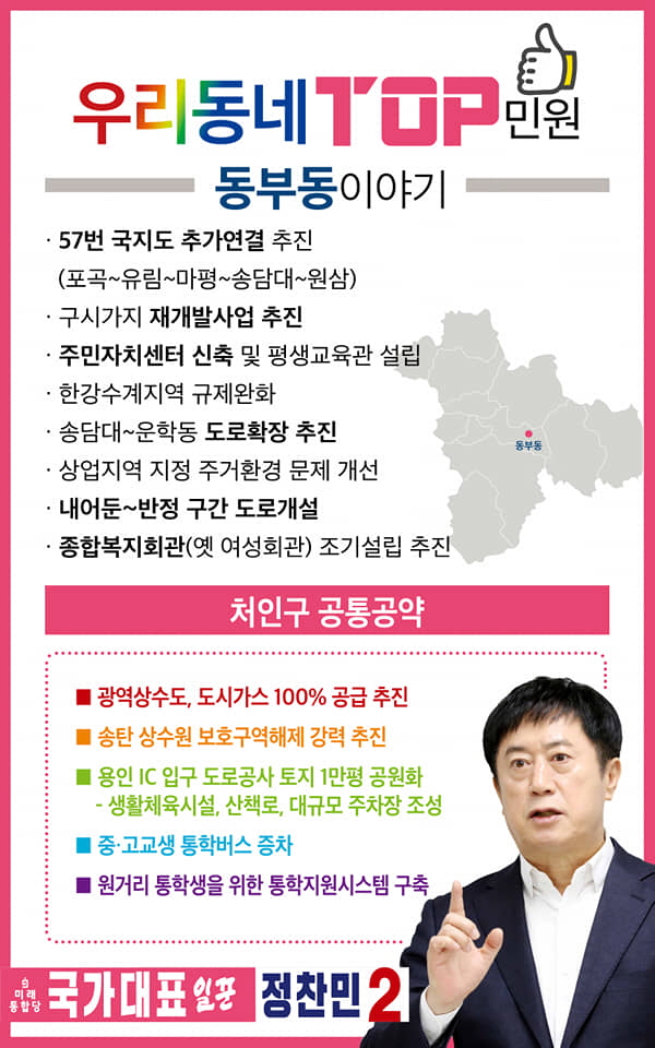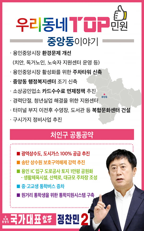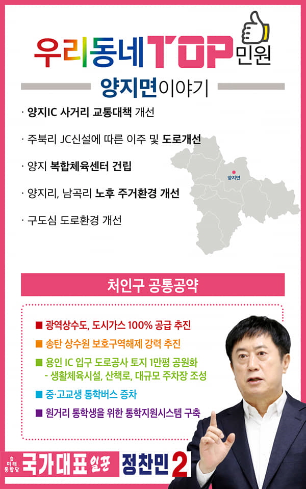 미래통합당 용인갑 국회의원 후보인 정찬민 전 용인시장은 지난 11일 처인구 관내 11개 읍면동에 대한 세 번째 지역으로 양지면, 중앙동, 동부동, 이동읍에 대한 공약을 발표했다.