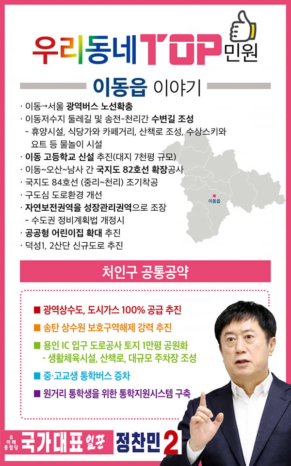 또 이동읍은 이동저수지 둘레길 및 송전~천리간 수변길을 조성하며 ▲이동~서울간 광역버스 노선 확충 ▲이동~오산~남사간 국지도 82호선 확장 ▲중리~천리간 국지도84호선 조기착공 ▲고등학교 신설 ▲공공형 어린이집 확대 ▲생활체육공원 조성 ▲ 자연보전권역을 성장관리권역으로 조정 ▲덕성1,2산단 신규도로 등을 추진한다.