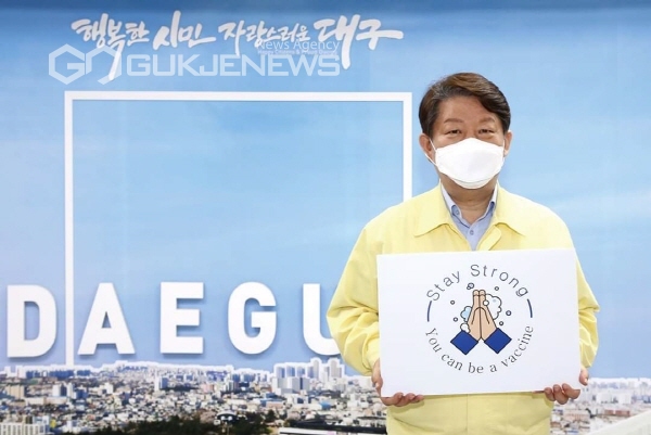 (대구=국제뉴스) 백운용 기자 = 14일 권영진 대구광역시장은 자신의 페이스 북을 통해서 코로나19 극복을 위한 #StayStrong 캠페인에 참여한다고 밝혔다.
