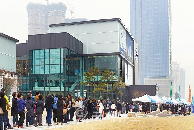 모델하우스 오픈 첫날인 31일, 이른 시간부터 모델하우스를 방문하려는 예비 수요자들이 모델하우스 밖으로 길게 줄을 서 입장을 기다리고 있다.