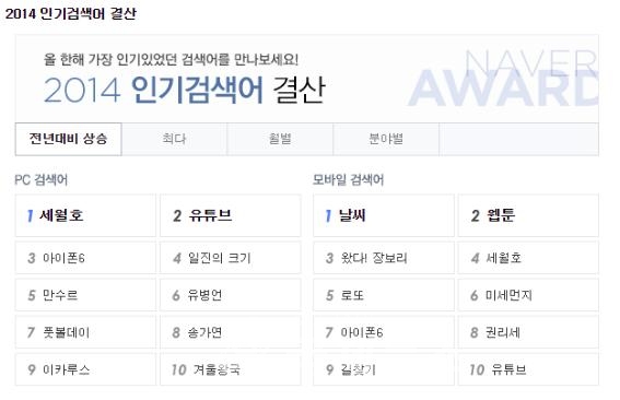 '2014 인기검색어 결산(바로가기)'은 2014년 1월부터 11월까지 이용자들이 PC와 모바일 통합검색창에 많이 입력한 키워드를 대상으로 집계했으며, 올해는 ▲ 전년도에 비해 검색횟수가 가장 많이 증가한 '작년 대비 상승' ▲ 절대량 기준으로 가장 많이 입력한 '최다' ▲ 월별로 가장 많이 검색한 '월별'▲ 인물, 영화, 음악 등 분야별로 가장 많이 입력한 ‘분야별 등 4가지 기준으로 인기검색어를 산출했다.