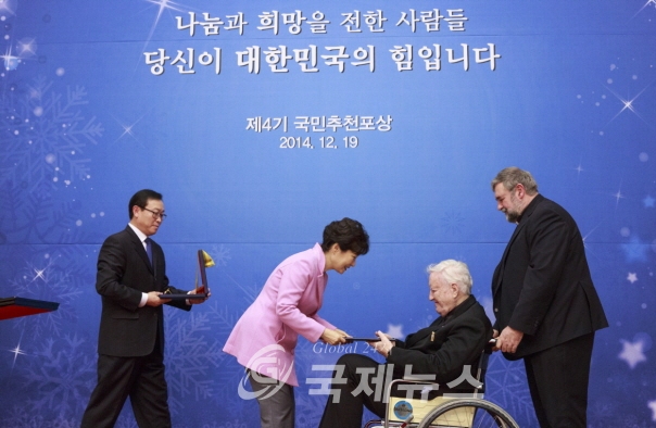 (서울=국제뉴스) 김철민 기자 = 박근혜 대통령이 19일 오후 청와대에서 국민추천 포상 수여식에 참석, 패트릭 제임스 맥그린치 신부에게 국민훈장 모란장을 수여하고 있다.