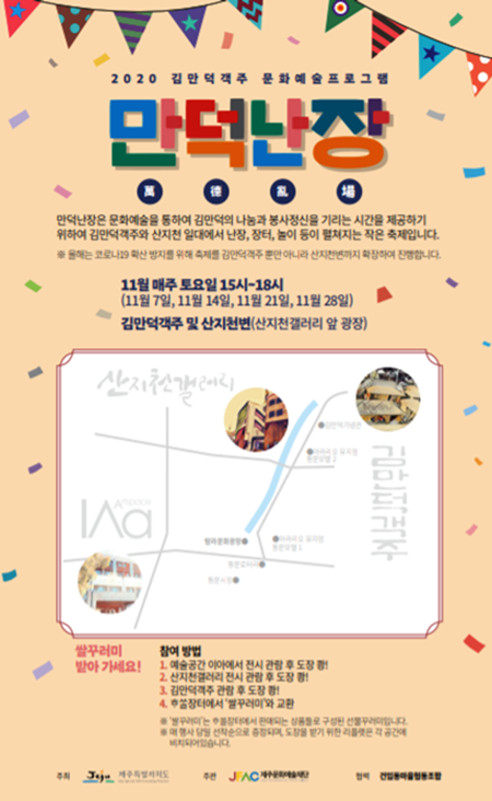 이번 ‘만덕난장’은 코로나19 확산 방지를 위해 산지천갤러리 앞 광장까지 행사공간을 확장하여 행사를 진행한다.