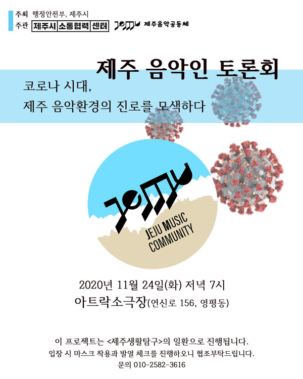 제주도 음악 환경의 현재를 성찰하고 실질적 대안을 모색하고자 지난 7월 결성된 제주음악공동체 제뮤 (JEMU)가 <코로나 19, 제주음악 환경 실태 공유 및 대안을 위한 “제주음악인 토론회”>가 24일 오후 7시 아트락 소극장 (연신로 156, 영평동)에서 열린다.