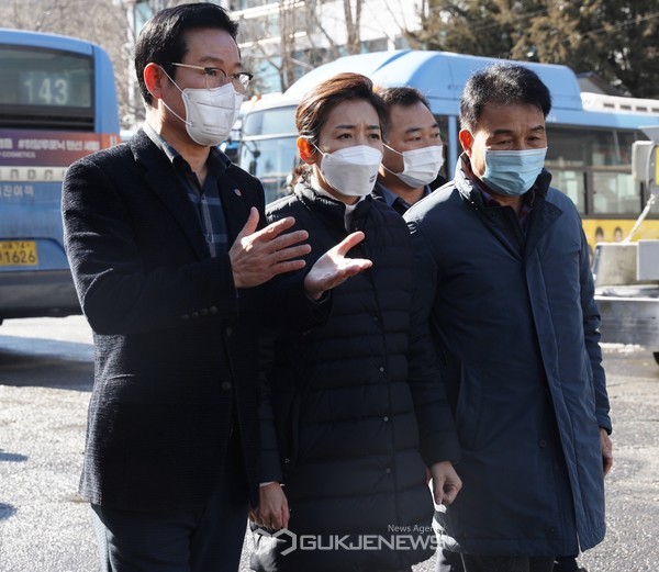 (서울=국제뉴스) 주성진 기자 = 나경원 서울특별시장 예비후보(국민의힘)는 4일 오전, 서울 성북구의 한 시내버스 운수회사에 방문, 버스 전기충전 시설을 점검하고, 노사 관계자들과 간담회를 진행했다.