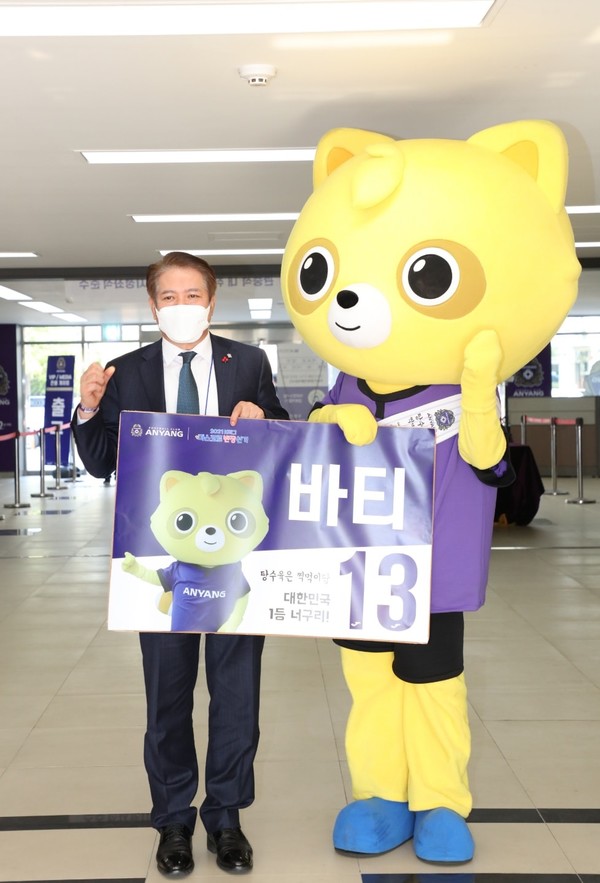 이어 "하프타임에는 K리그 마스코트 반장선거에 FC안양 바티가 출마 선언을 했다"며 "1, 2부리그 총 22개의 마스코트 가운데 우리 바티가 반장에 당선되길 기대한다"고 했다.