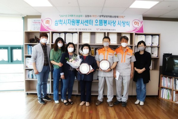 이번 시상식에서 개인부문은 취약계층을 위한 물품전달과 클린강원 활동으로 코로나19 방역에 힘쓴 김정수 자원봉사자, 단체부문은 노인안전 돌봄 서비스와 소방시설 설치, 방역활동 등 안전분야에서 활발한 발자취를 보인 삼척남성의용소방대(대장 최종희)가 선정됐다.
