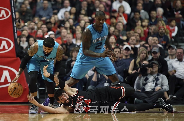 Mar 23, 2015; Chicago, IL, USA; Charlotte Hornets guard Mo Williams (7) steals the ball away from Chicago Bulls forward Nikola Mirotic (44) during the first half of their NBA game at United Center. Mandatory Credit: Kamil Krzaczynski-USA TODAY Sports