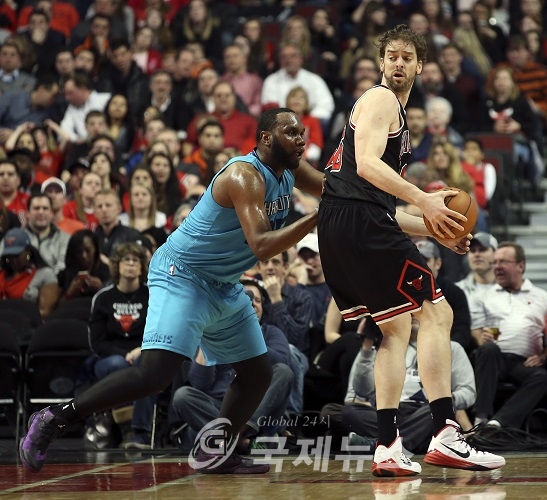 Mar 23, 2015; Chicago, IL, USA; Chicago Bulls forward Pau Gasol (16) is defended by Charlotte Hornets center Al Jefferson (25) during the first half of their NBA game at United Center. Mandatory Credit: Kamil Krzaczynski-USA TODAY Sports