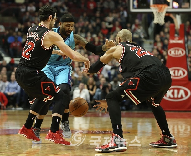 Mar 23, 2015; Chicago, IL, USA; Charlotte Hornets guard Mo Williams (7) is defended by Chicago Bulls guard Kirk Hinrich (12) and forward Taj Gibson (22) during the first half of their NBA game at United Center. Mandatory Credit: Kamil Krzaczynski-USA TODAY Sports