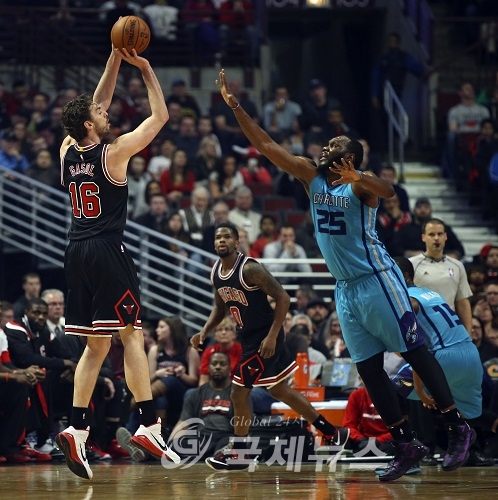 Mar 23, 2015; Chicago, IL, USA; Chicago Bulls forward Pau Gasol (16) shoots against Charlotte Hornets center Al Jefferson (25) during the first half of their NBA game at United Center. Mandatory Credit: Kamil Krzaczynski-USA TODAY Sports