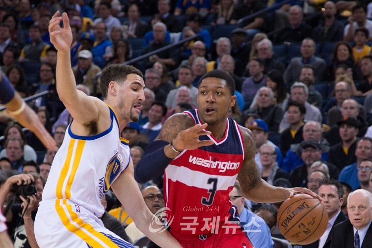 March 23, 2015; Oakland, CA, USA; Washington Wizards guard Bradley Beal (3) dribbles the basketball against Golden State Warriors guard Klay Thompson (11) during the first quarter at Oracle Arena. Mandatory Credit: Kyle Terada-USA TODAY Sports