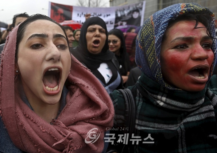 Members of civil society organizations chant slogans during a protest to condemn the killing of 27-year-old woman, Farkhunda, who was beaten with sticks and set on fire by a crowd of men in central Kabul in broad daylight on Thursday, in Kabul March 24, 2015. REUTERS/Omar Sobhani