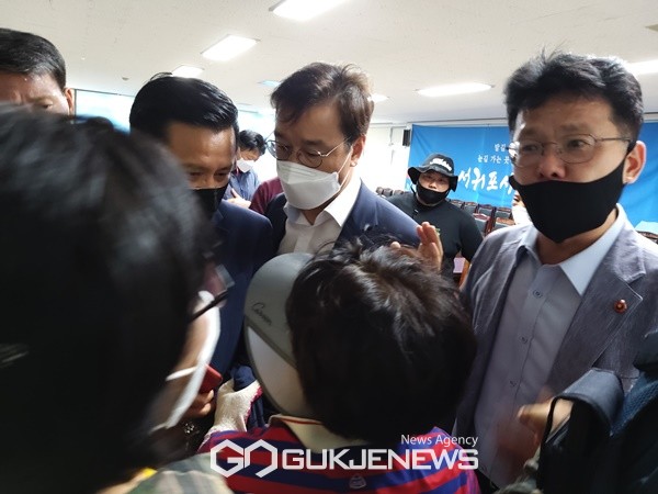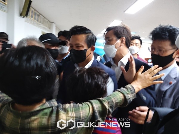 (제주=국제뉴스) 문서현 기자 = 위성곤 국회의원이 제주 제2공항 건설촉구 범도민연대와 성산읍청년희망포럼 회원들에게 물 폭탄 세례를 맞는 등 곤욕을 치렀다.
