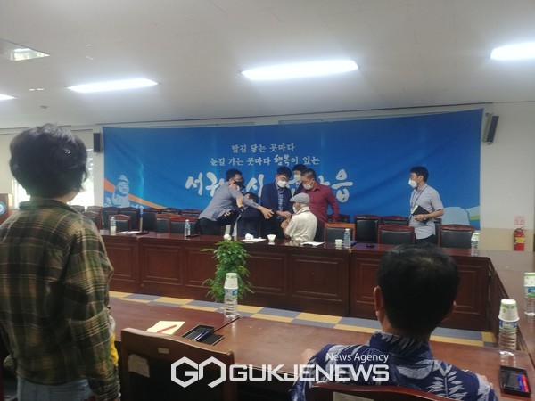 이들 단체는 이날 위성곤 의원에게 성산읍민과 제주동부지역 주민들에게 먼저 사과하라고 목소리를 높였고, 이 과정에서 고성이 오가고 물병 투척 등 몸싸움이 일기 시작했다.