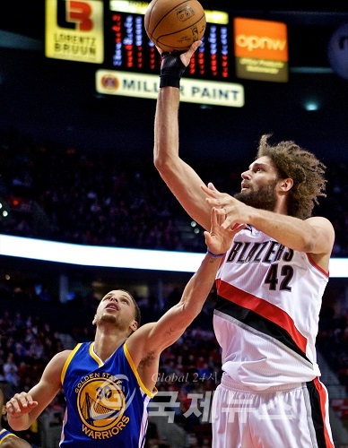 Mar 24, 2015; Portland, OR, USA; Portland Trail Blazers center Robin Lopez (42) shoots over Golden State Warriors guard Stephen Curry (30) during the third quarter at the Moda Center. Mandatory Credit: Craig Mitchelldyer-USA TODAY Sports
