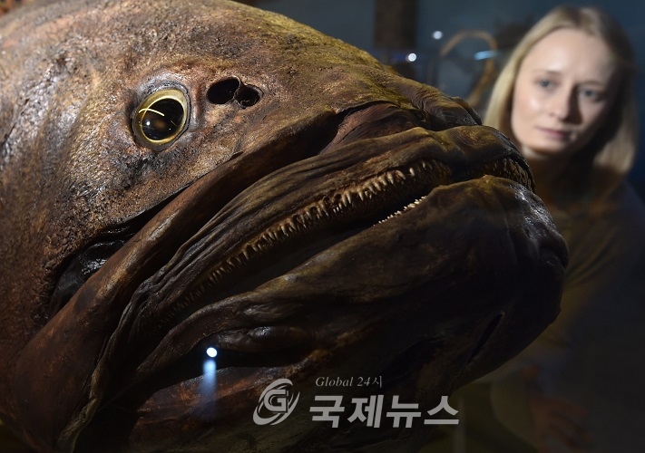 Museum employee Victoria views a giant grouper fish specimen at the Natural History Museum in west London March 25, 2015. It forms part of a new exhibition, 'Coral Reefs: Secret Cities of the Sea', featuring a panoramic virtual dive and over 250 specimens from the Museum's coral, fish and marine invertebrate collection, which opens on March 27. REUTERS/Toby Melville