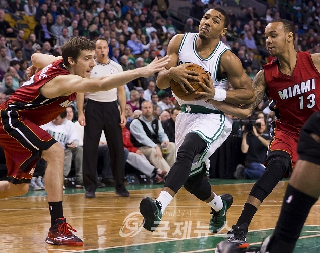 Mar 25, 2015; Boston, MA, USA; Boston Celtics guard Phil Pressey (26) tries to get between Miami Heat guard Goran Dragic (7) and Miami Heat guard Shabazz Napier (13) during the second half of the Miami Heat's 93-86 win over the Boston Celtics at TD Garden. Mandatory Credit: Winslow Townson-USA TODAY Sports