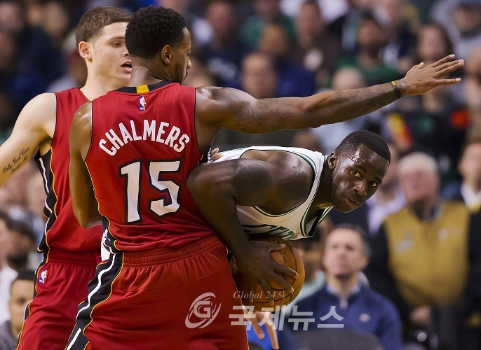 Mar 25, 2015; Boston, MA, USA; Boston Celtics forward Brandon Bass (30) looks for an opening around Miami Heat guard Mario Chalmers (15) during the second quarter at TD Garden. Mandatory Credit: Winslow Townson-USA TODAY Sports